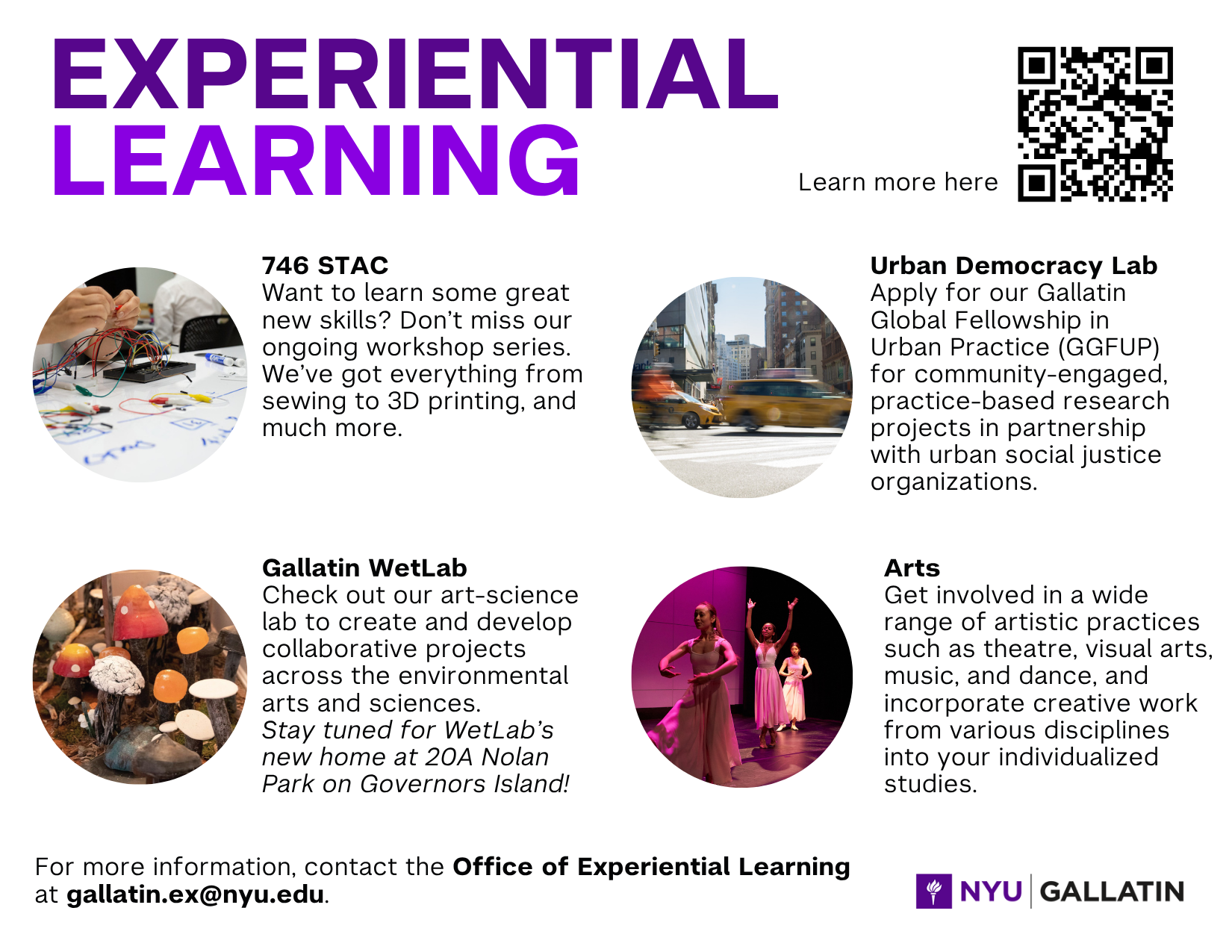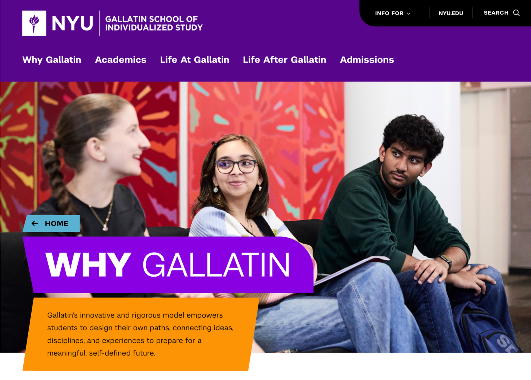 The NYU Gallatin School of Individualized Studies is a small interdisciplinary liberal arts college situated within the larger NYU. Students at Gallatin design their own interdisciplinary concentration, working with faculty advisers to create a unique program of study across different fields and schools within NYU.
